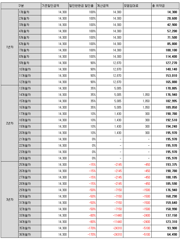 서비스정기계약할인반환금14,500원 (1년약정) - 10,000원(3년약정) * 12개월 = 54,000원 (부가세 별도)