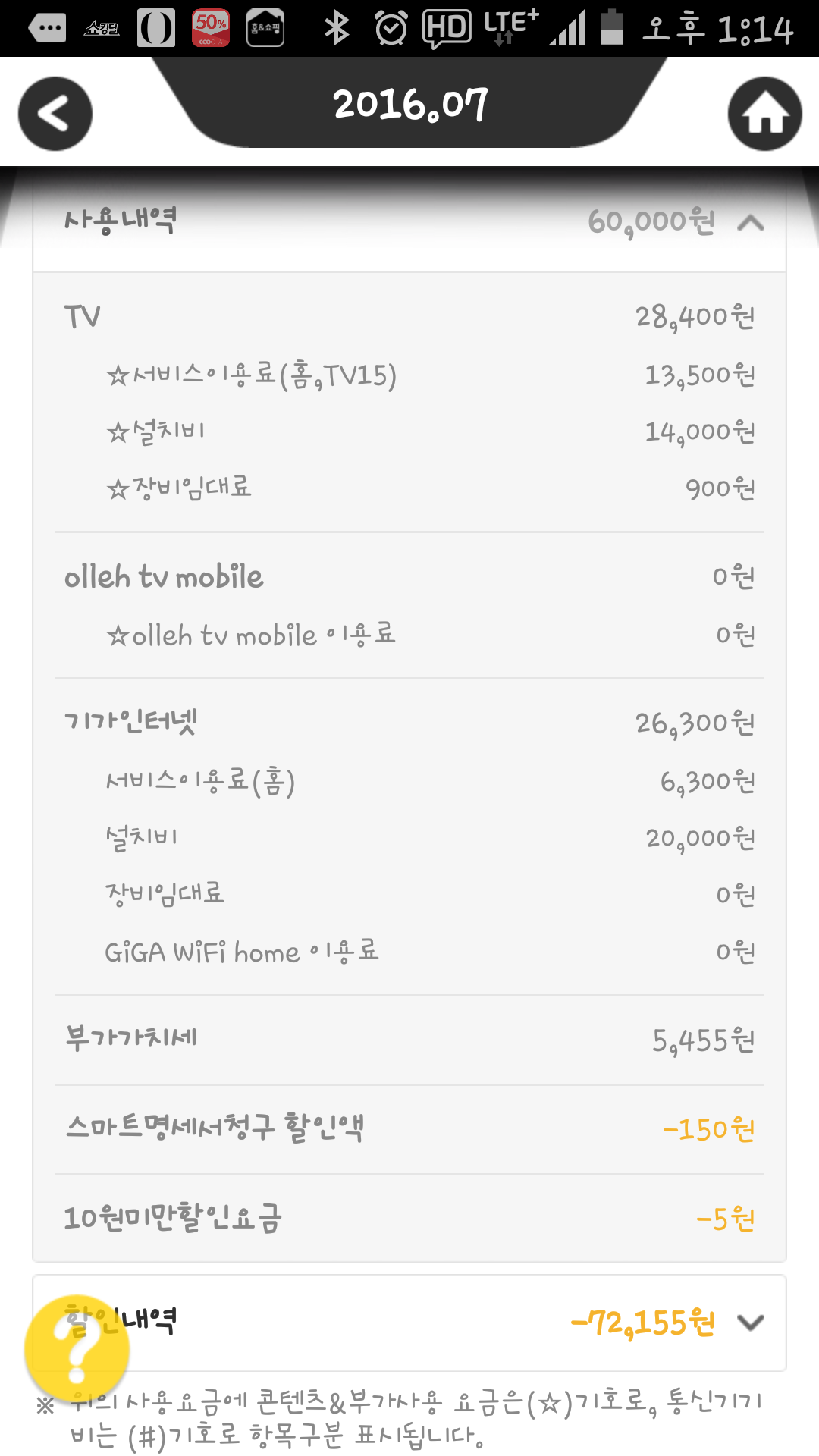 핸드폰으로 청구서 금액을 확인하니 6만원이라는 요금이 나와서 놀라셨군요