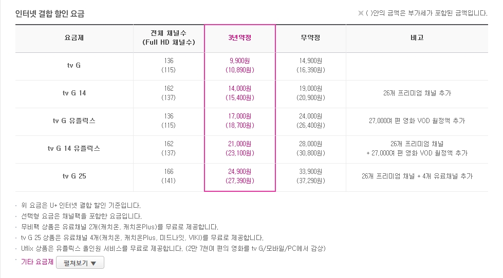따라서 인터넷 + TV 결합 3년 약정 기준으로,