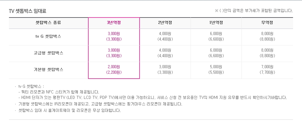 *보급형 TV는 채널료 월 7,700원 + 고급형 셋탑 임대료 3,300원 = 총 11,000원