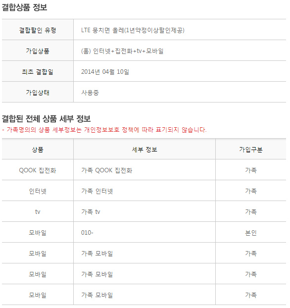 이게 지금 받을 수 있는 혜택의 최선인가요? 분명 kt결합시에 인터넷 무료를 확인하고 결합을 했던걸로 아는데 말입니다. 제가 당사자가 아니라서 결합후에 내용을 확인 못하다가 이제서야 확인해 보니 저렇더라고요. 참고로 최초 결합시(아마도 14년 4월)에는 3g폰이 있었고요. 인터넷+tv+전화는 매형 명의에 다른 가족 3명이 kt핸드폰이었습니다. 그때는 매형이 lg폰이었는데, 올해 4월달에 매형도 핸드폰을 kt로 옮겨서 4명이 결합된 상태입니다.