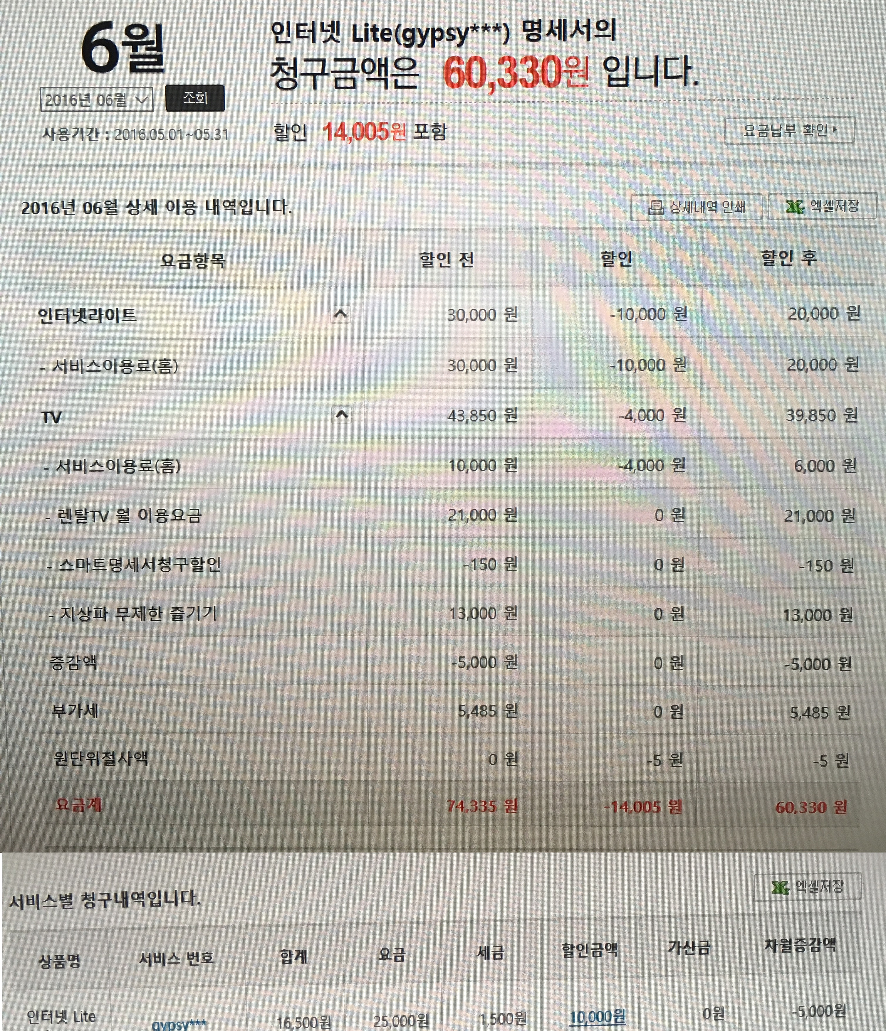 현재 KT TV(TV렌탈포함)+인터넷=60,330원에 이용중인데요