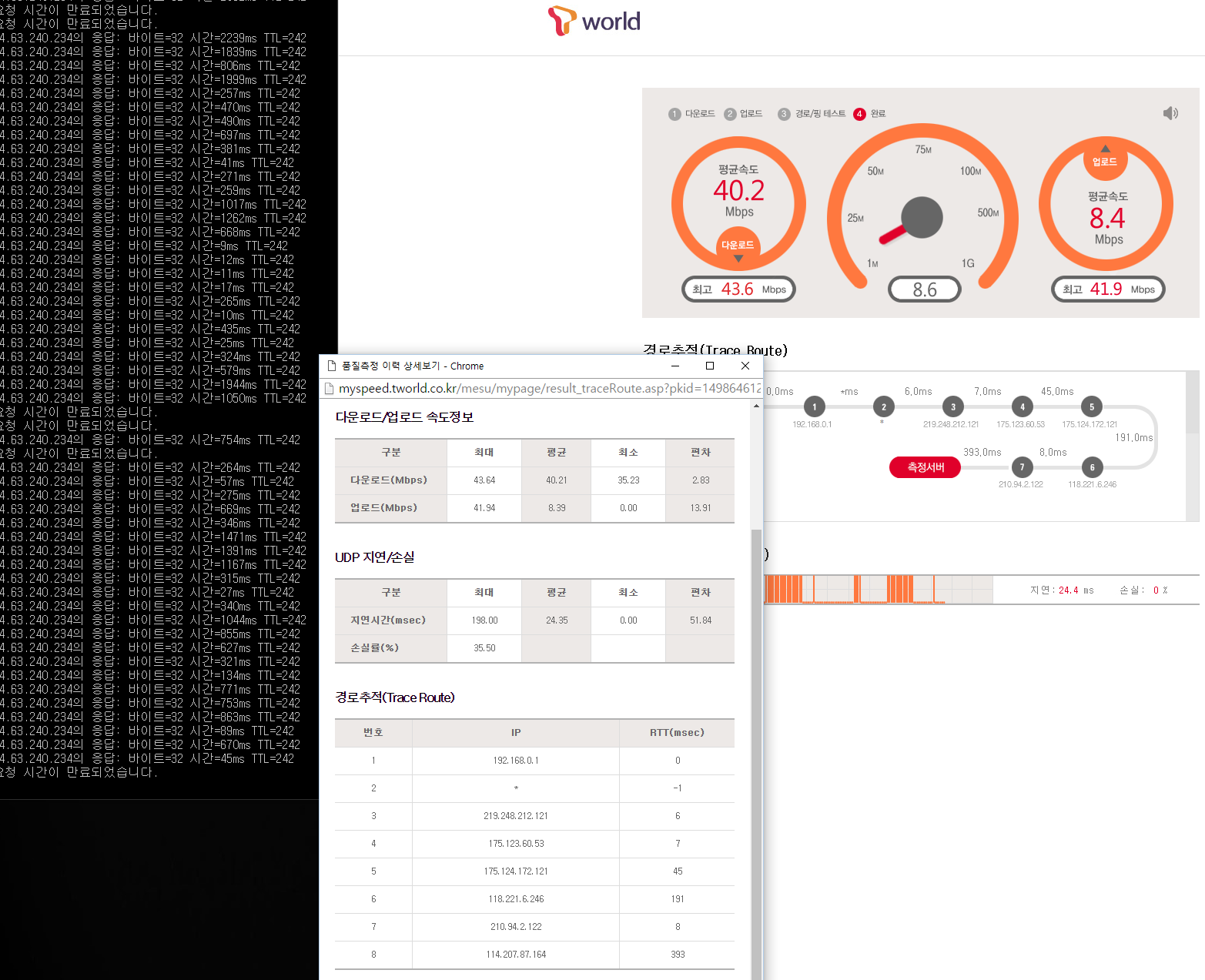 핑 테스트 장면을 캡쳐하여 두번 AS기사님의 수리를 받았습니다.