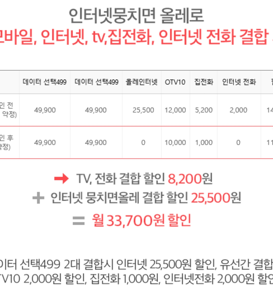 그리고 28,050원 할인은 위에서 말씀드렸다시피 100메가 올레 인터넷 기준입니다~