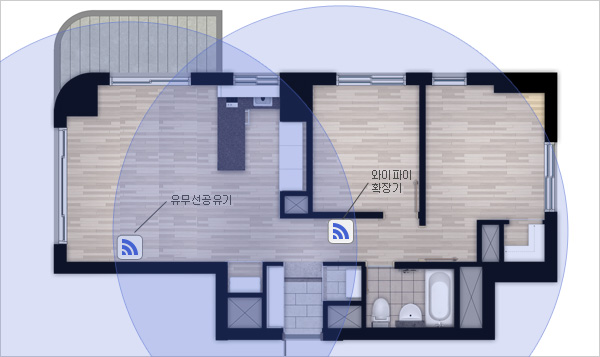 그 신호가 확장되어 거실에서도 무선인터넷을 끊김없이 잘 사용하실 수 있을거에요!