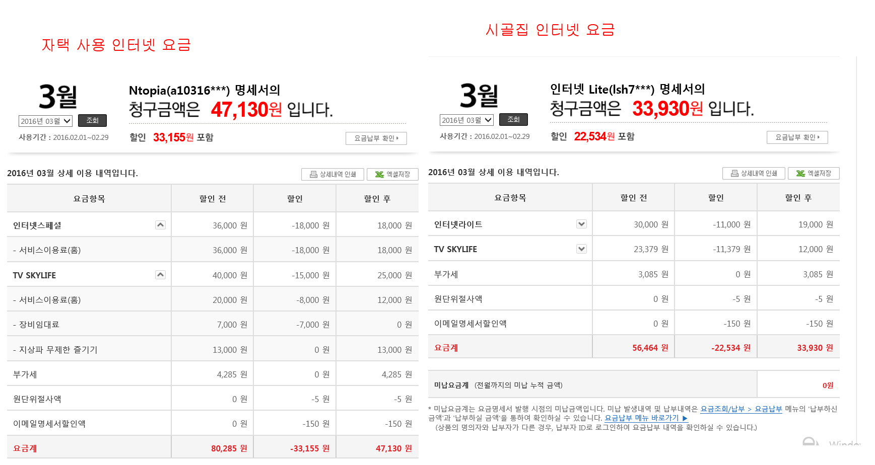 한쪽은 아마 패밀리 결합할인을 받고계신 것 같고,