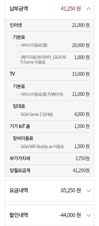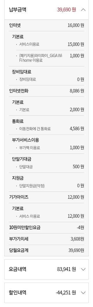 * 월요금 : 100메가 와이파이 (모회선) 인터넷 22,000원 + 베이직 IPTV (UHD4셋톱) 16,500원 = 총 38,500원 부과