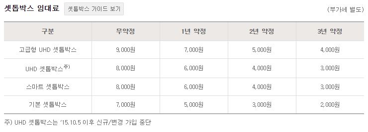 본사 공식 홈페이지가 "셋톱박스 임대료"를 별도 표기하기 때문이에요.