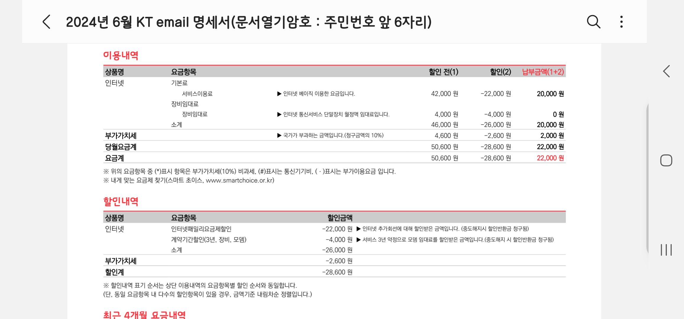 추가로 인터넷패밀리요금제할인을 받고 있는데요.