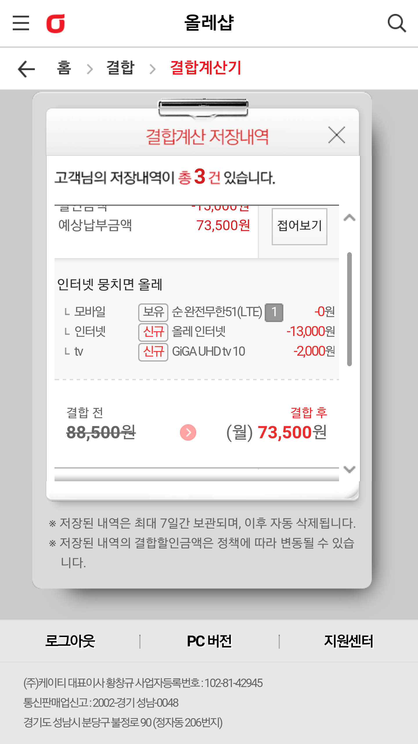 앗! KT 홈페이지에서 결합계산기로 계산을 해보셨군요! ^^