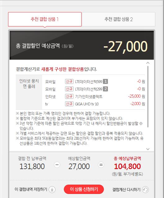 599요금제 1회선 + 299요금제 2회선으로 => 총 3회선 결합기준으로