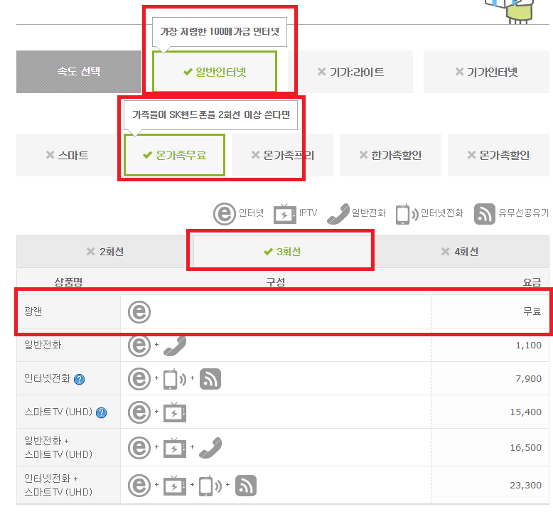 일단은 skt 온가족무료 입니다. 그런데 3회선으로는 광랜을 쓸려면 무료 혜택을 못 받는 것같은데