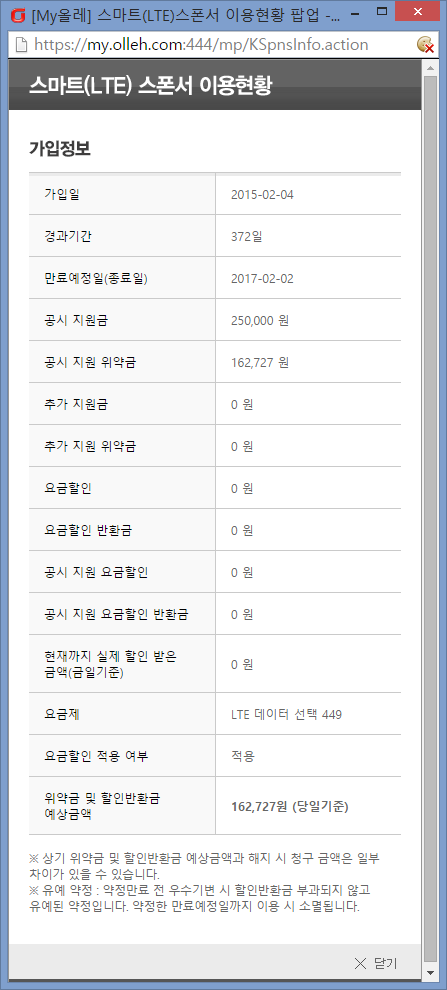 인터넷은 2002-02-19에 개통하여서 현재 13년 11개월(일시정지기간 포함) 동안 사용하였습니다. 약정은 3년으로, (재약정A형) 올해에 약정이 끝나는걸로 알고 있습니다(정확히 언제 끝나는지 올레 홈피에서 조회가 안되네요).