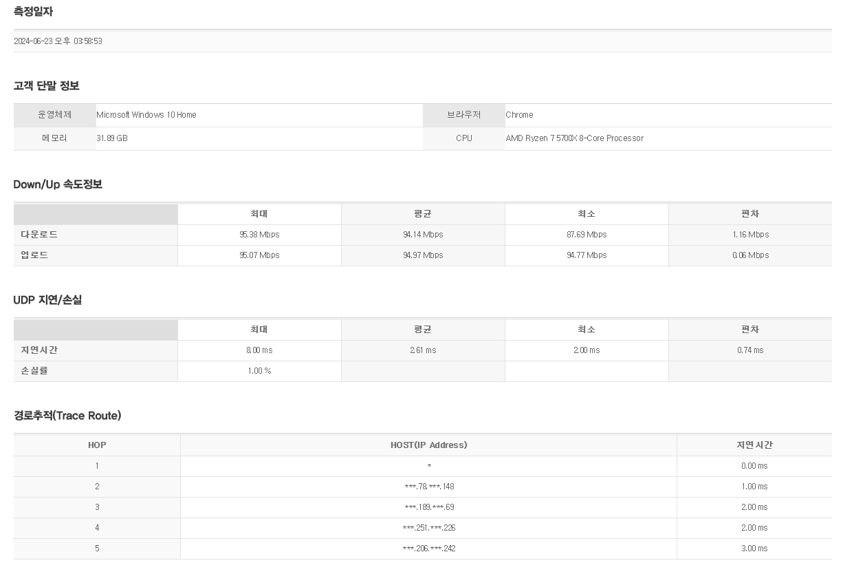 추가로 인터넷 속도는 데스크탑에서 유선 이더넷으로 속도를 측정하였습니다.