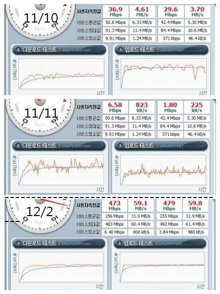 벤치비에서 11월부터 측정한 인터넷 속도 비교를 보니