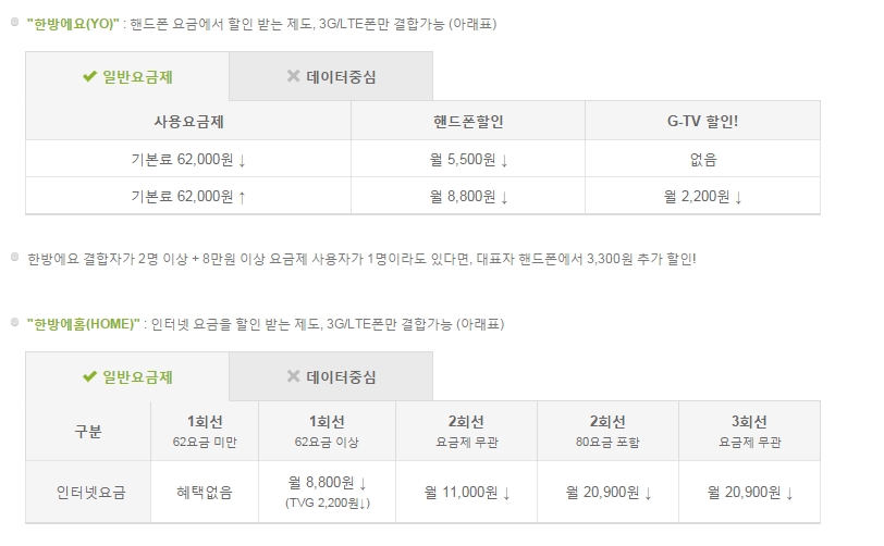 참고로 한방에홈으로 결합이 가능한 요금제가 따로 있어요~!