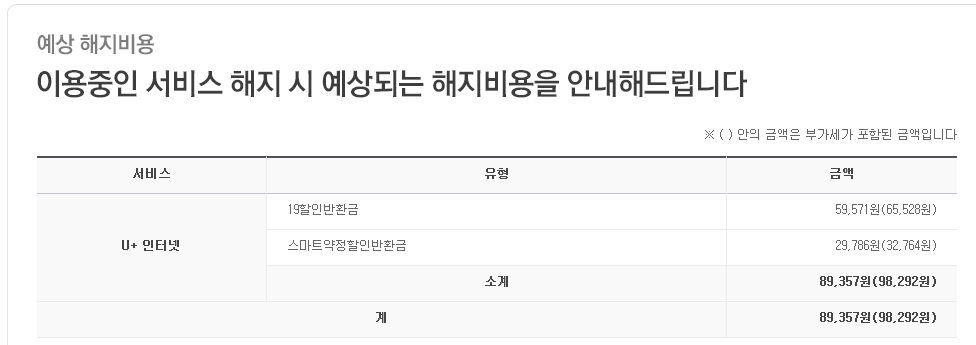 그런데 15년2월에 단독으로 재약정한, 인터넷을 해지하게되면 약정 위약금으로 현재로선 89000원정도가나오는데요,
