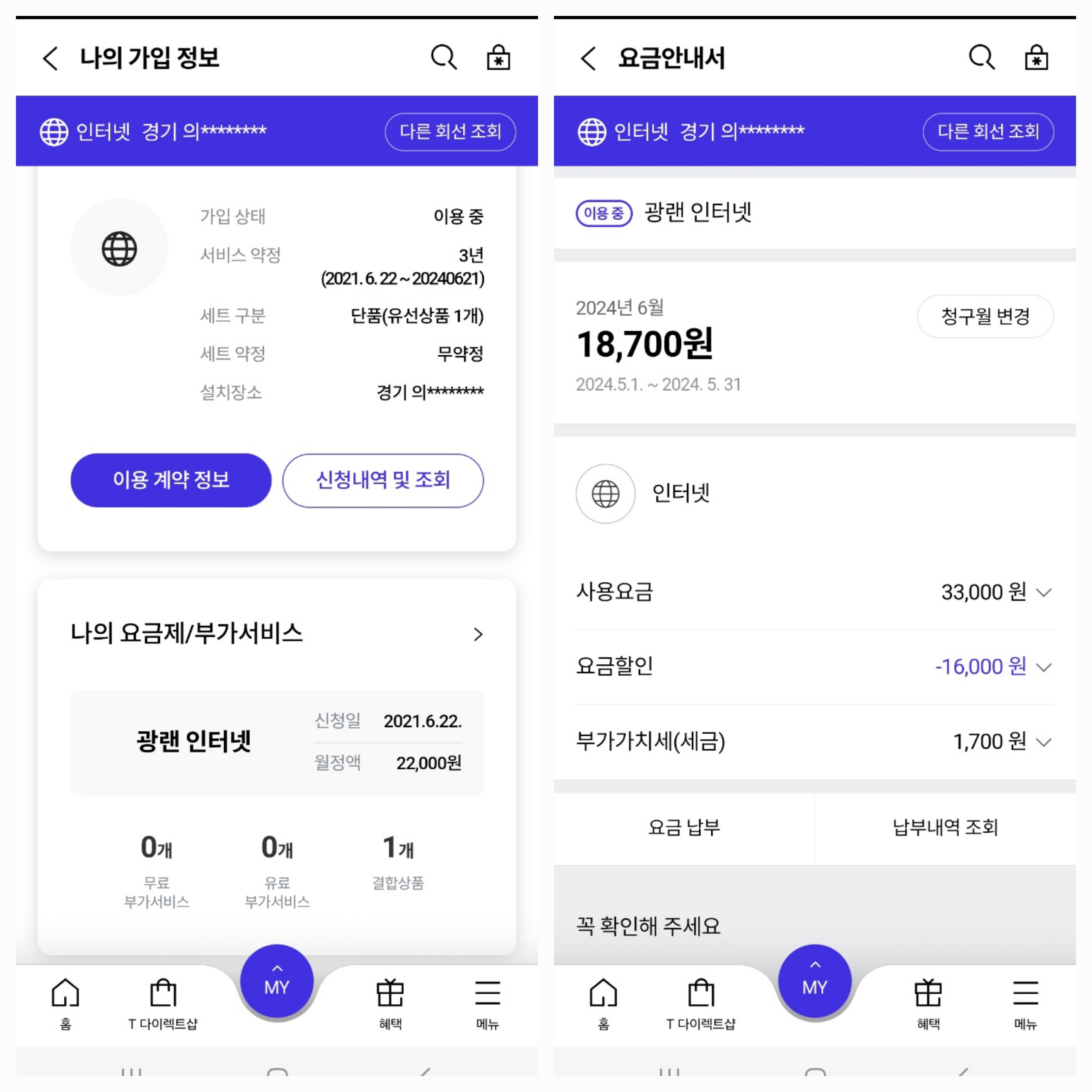-> 그리고 온가족프리 결합으로 할인이 들어가서 18,700원이 최종 요금이 된 것입니다