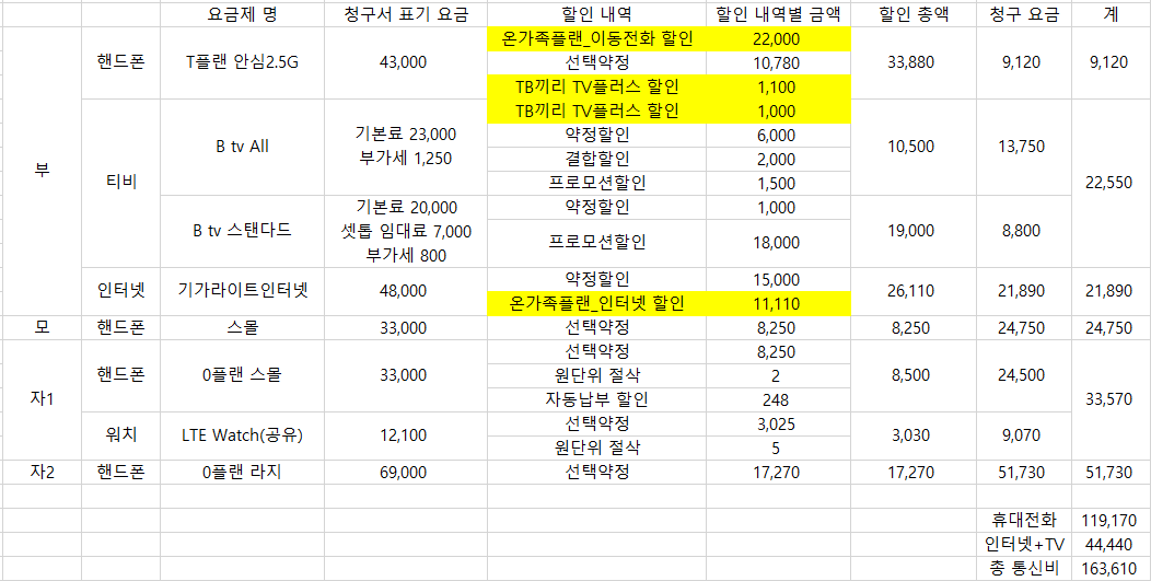 가족 4명이 5개 회선 모두 SKT에서 선택약정으로 할인받고 있으며 4명 모두 장기가입고객입니다(총 가입연수는 확인하지 못했습니다).  TV와 인터넷도 SK브로드밴드에 가입해 결합할인 받고있습니다.