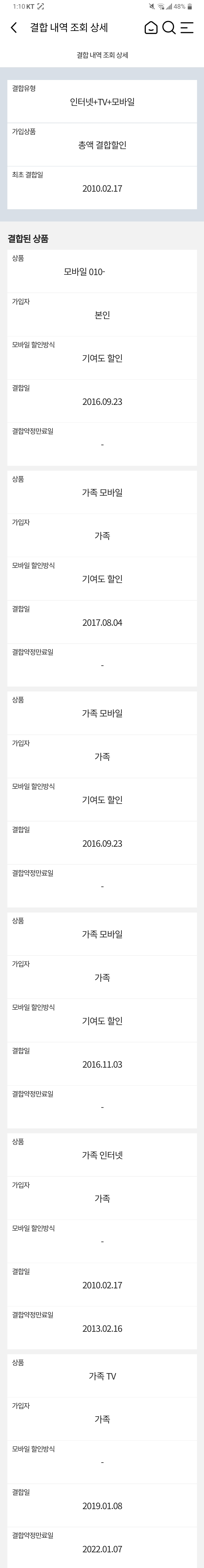 가족 결합할인 관련해서 찾아보다가 인터넷이랑 tv가 결합약정만료일이 지난 것이 확인되어 궁금해서 문의드립니다.