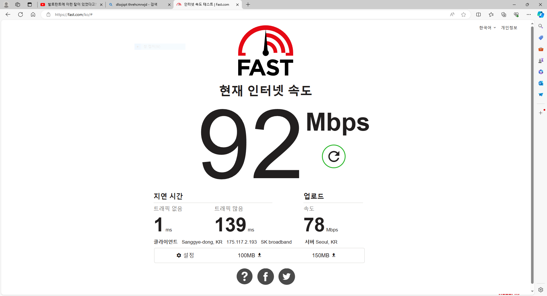 사용하신 속도 측정 사이트 'fast.com'로는 제대로 된 속도를 측정하기 어렵습니다