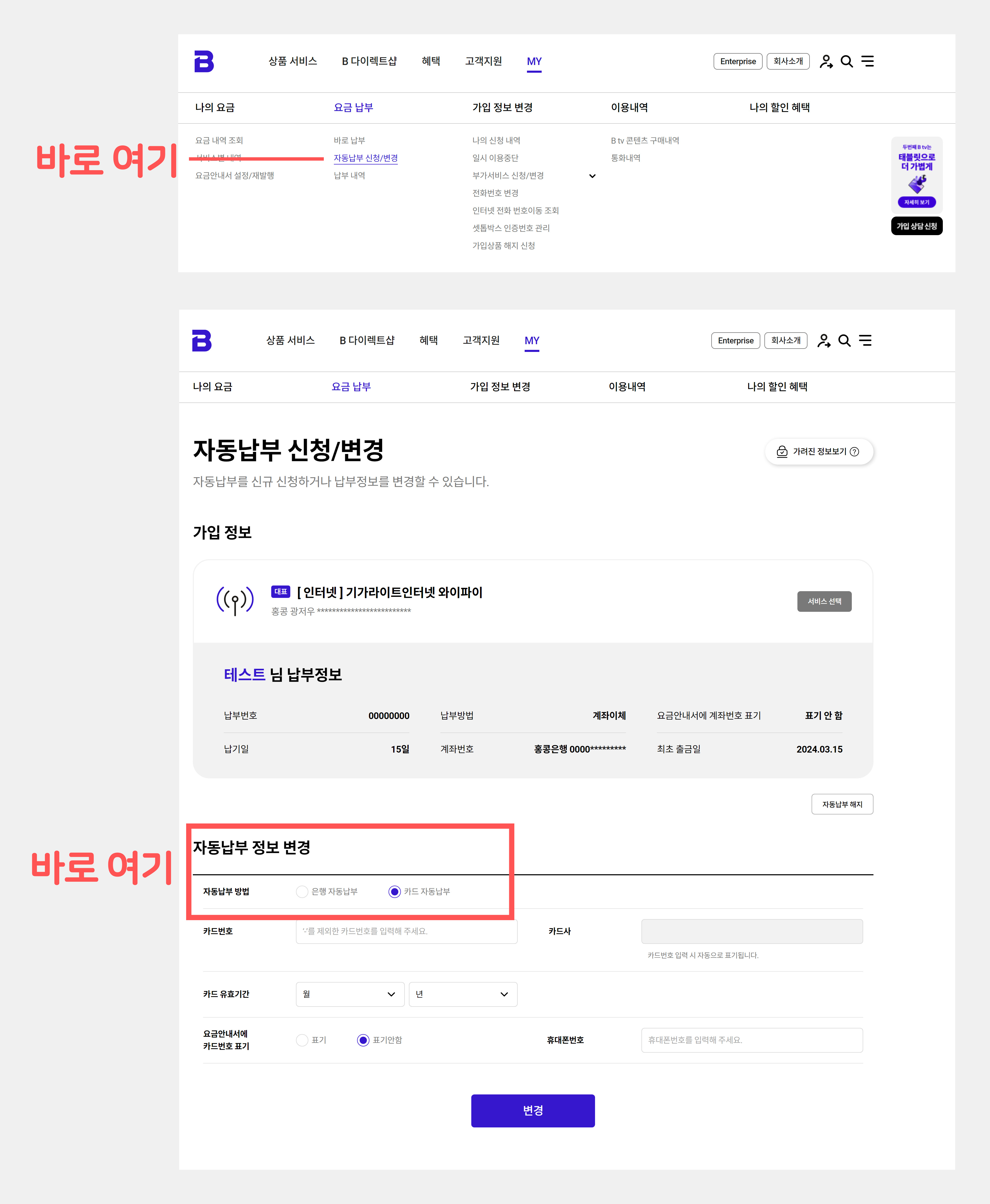 이 영역에서 [카드 자동납부]로 원하시는 카드 변경이 가능합니다.