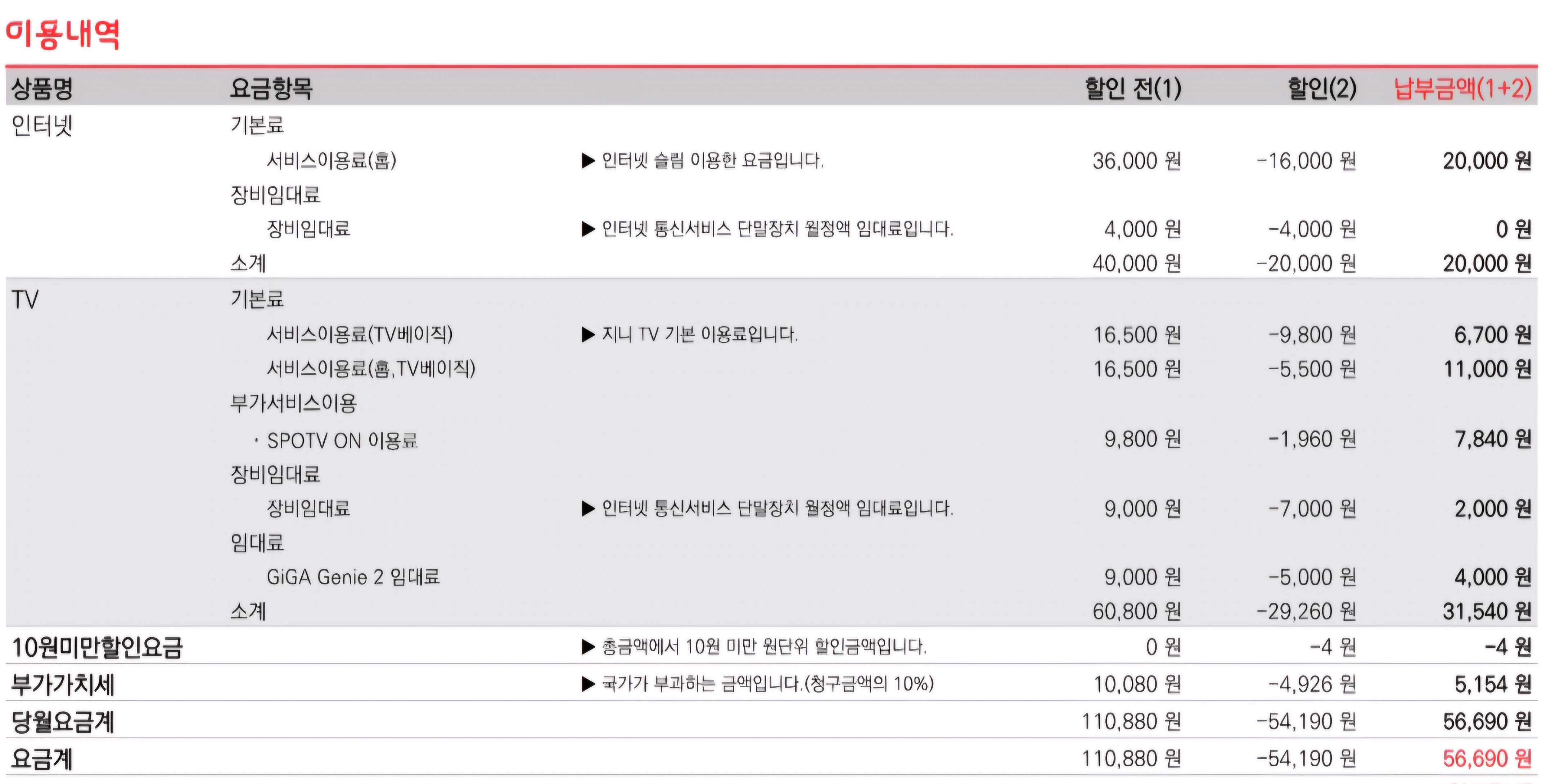 : 사업장 (배우자 명의) LG 100메가 + 티비 1대 = XX원