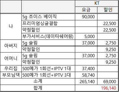 그리고 휴대폰은 저 1대, 부모님 2대 모두 자급제로 쓰고있어서 선택약정할인 받고 있는데 선택약정할인은 별도로 계산해야되는게 맞는거죠?