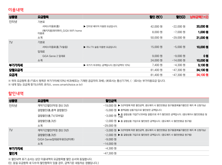 게다가 저랑 다른 가족이 LG 인터넷을 쓰고 있어서 결합 할인도 가능하고요