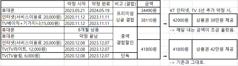 KT에 문의하니 3년 추가 약정 시 아래(표 오른쪽)와 같은 조건이라고 합니다.