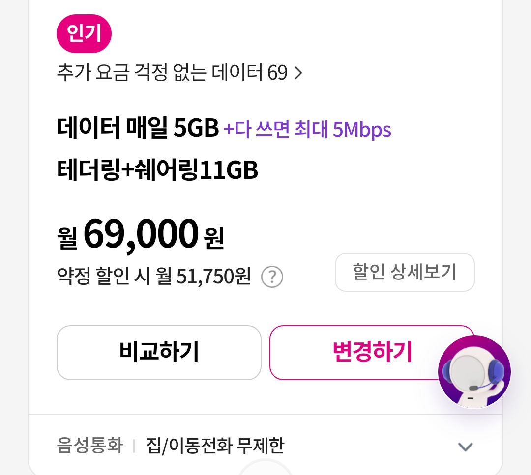 추가요금걱정없는데이터69 요금제로 변경하셔도 동일한 결합할인을 받을 수 있어요 +_+