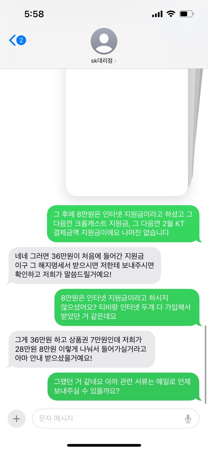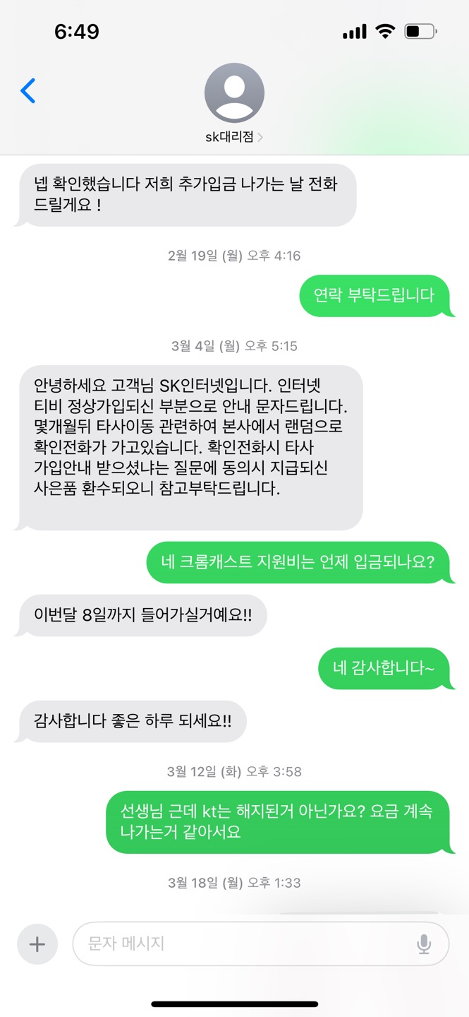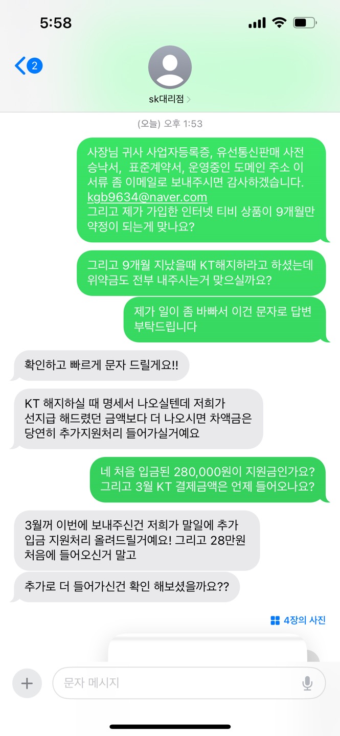 이렇게 답변을 받았습니다... 세번째 통화한 sk 직원이 말한거 듣고는 뭐가 먼지 도통 모르겠어요ㅠ 아 그리고 업체측과 문자로 연락이 되고 있긴 합니다. 오늘 제가 연락 드렸거든요. 사기업체 같아서 영업 관련 서류 요구 하고 위약금 관련 문의도 드렸더니 답장이 이렇게 왔네요.. 문자 내용도 같이 첨부하겠습니다.