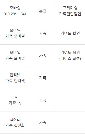 - 예. 현재 KT를 계속 쓰고 있으며, 가족들도 KT 쓰고 계셔서 가족할인이랑 받고 있는 상태입니다. 이미지 첨부해드렸습니다. 티비 인터넷은 혹시라도 만약에 해지해야하는 상황이 온다면... 고려해봐야할 거 같아요.