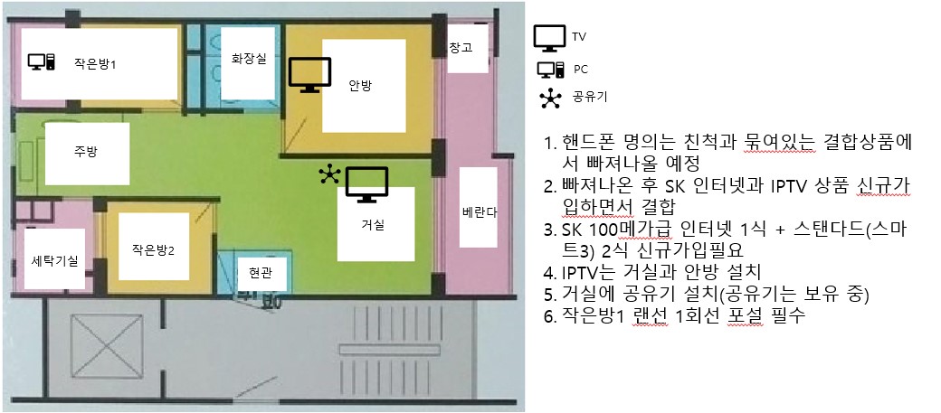 1. 인터넷은 유선으로 거실, 안방, 작은방1 에 공급되어야 합니다