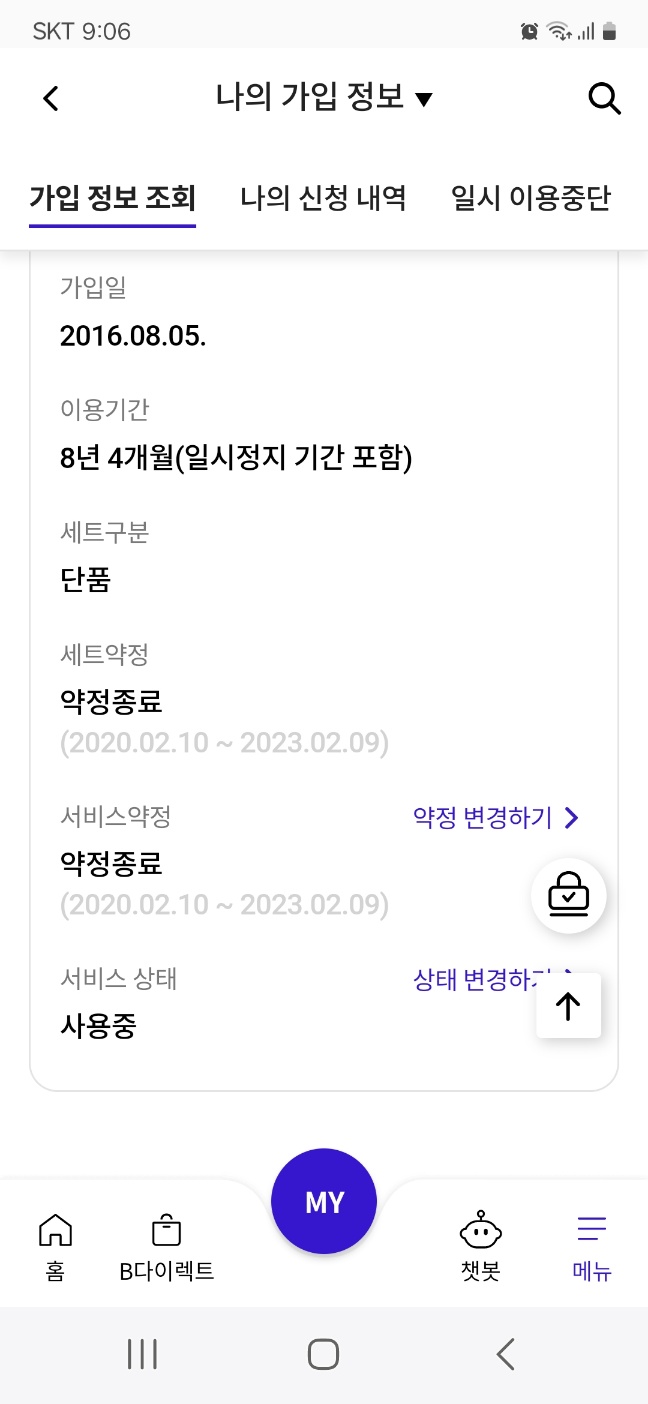 제가 올 초에 본가에서 SK 브로드밴드에 전화드려서 어머니에게 5만원 신세계 상품권을 받게 해드려서 저는 재약정이 된 것으로 기억하고 있었는데요. 어머니 B world 앱으로 확인해보니 약정 종료된 상태에서 유지되고 있었네요