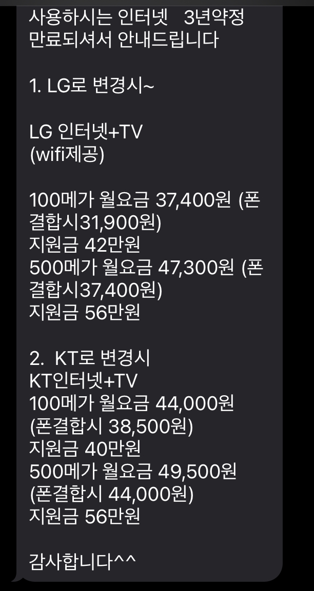 한편 문자로 KT와 LG인터넷 요금/사은품 안내를 받으셨잖아요~?!