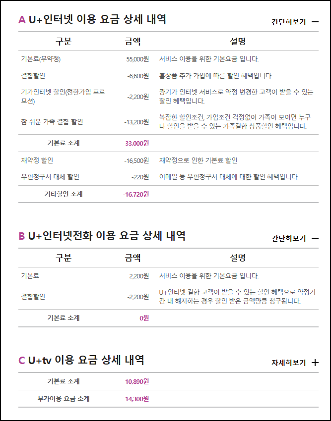 ---> 인터넷 : 기본료에서 결합할인 6,600원 기가인터넷프로모션 할인 2,200원, 참 쉬운 가족결합할인 13,200원 재약정 할인 16,500 원 할인받아 16,720 원