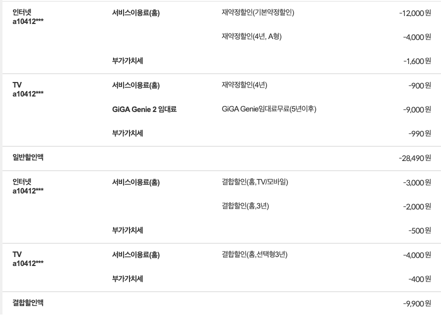 아래는 제가 이용 중인 상품 요금과 할인 현황입니다.