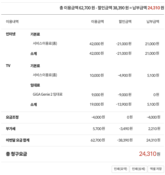 현재 케이티 인터넷(500M) + TV 이용 중입니다. 금액은 24,310 원이고요.