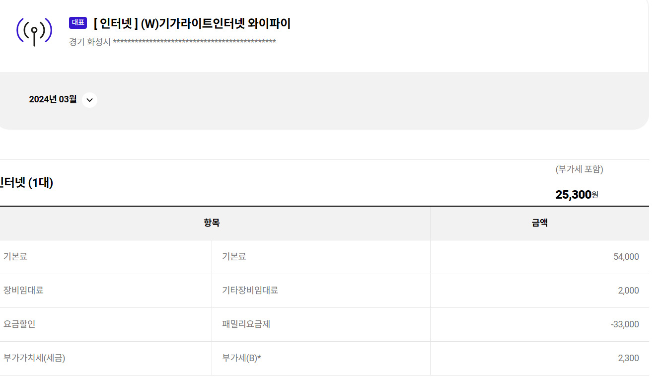 1년 약정으로 기가라이트 인터넷 와이파이만 신청했었습니다.