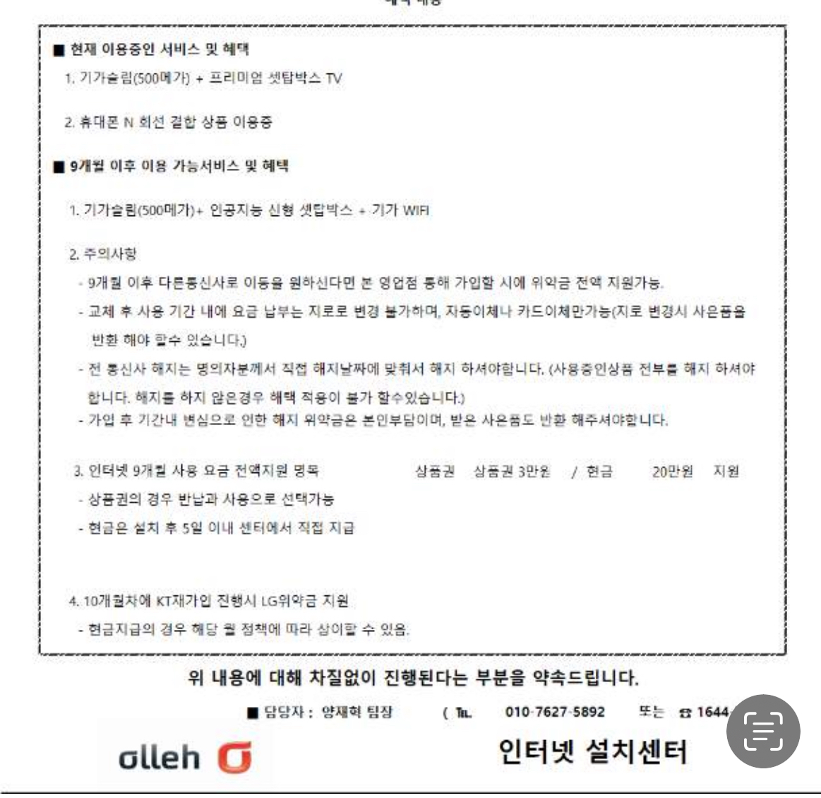 -KT 대리점이라며 계약 만료 대상으로 요금 지원 해준다며 연락왔고, 하기 조건이라 크게 나쁠건 없다 생각했고... 설치까지 완료된 상태