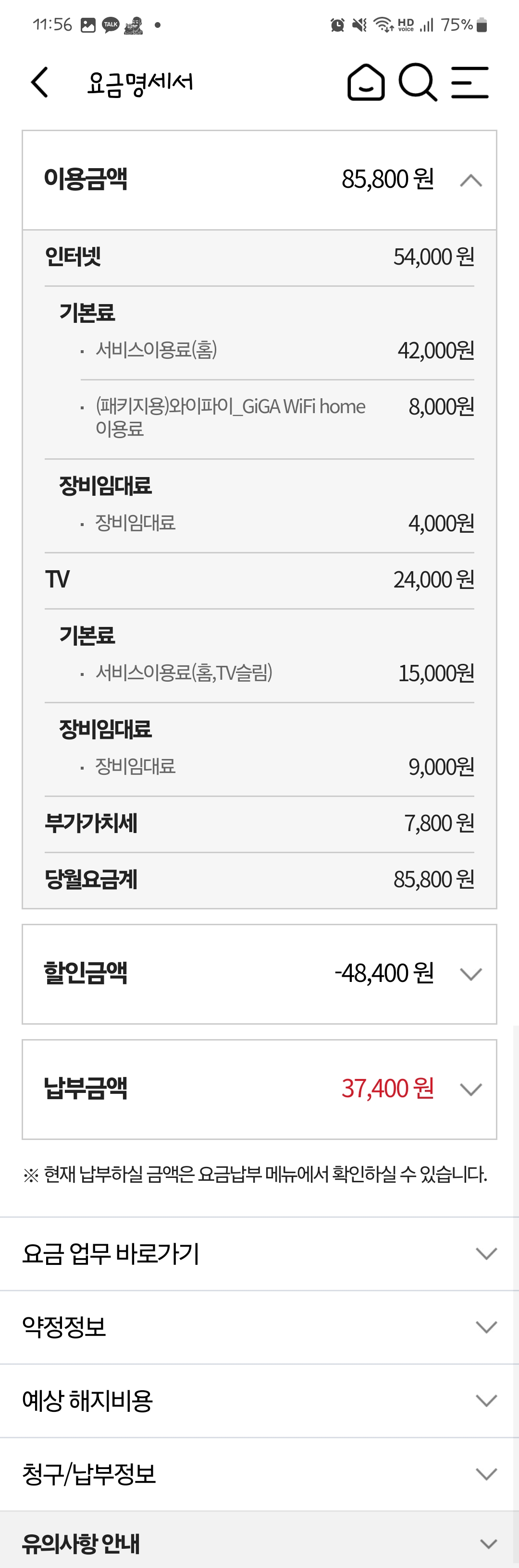 37,400 -> 패밀리자회선 제거(5500원정도? 추가) + tv요금제 변경할인(1,800원 할인?)으로 인해 41,800원이라고 합니다.
