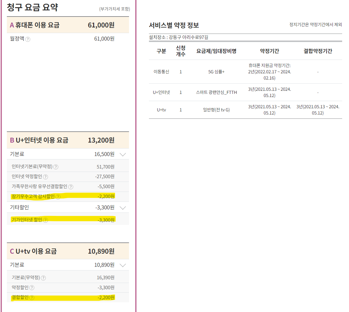 제가 추측했을 땐 기가급 인터넷으로 변경하며 재약정하여 인터넷 요금 할인이 적용된 게 아닐까 싶어요🙋‍♀️