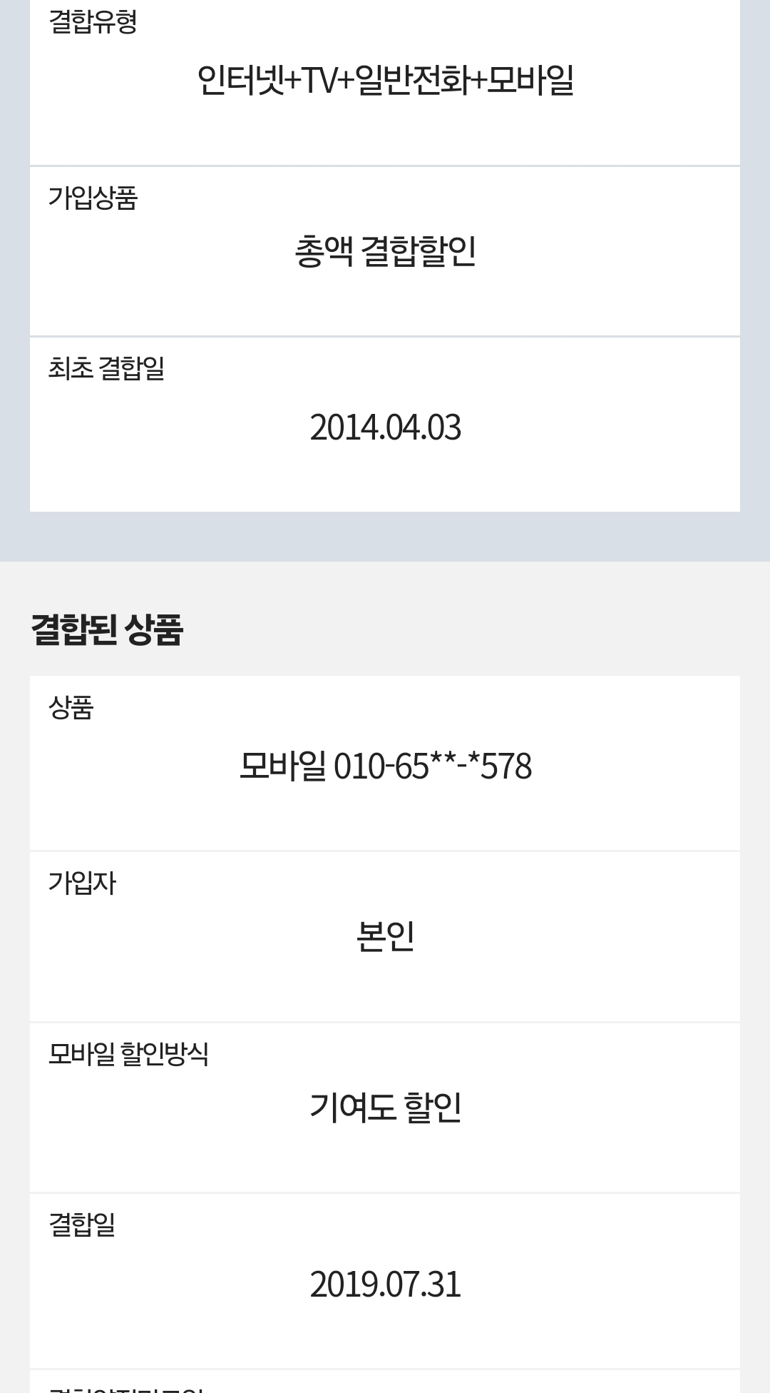 본인-스페셜요금제 / 가족인터넷+티비+집전화