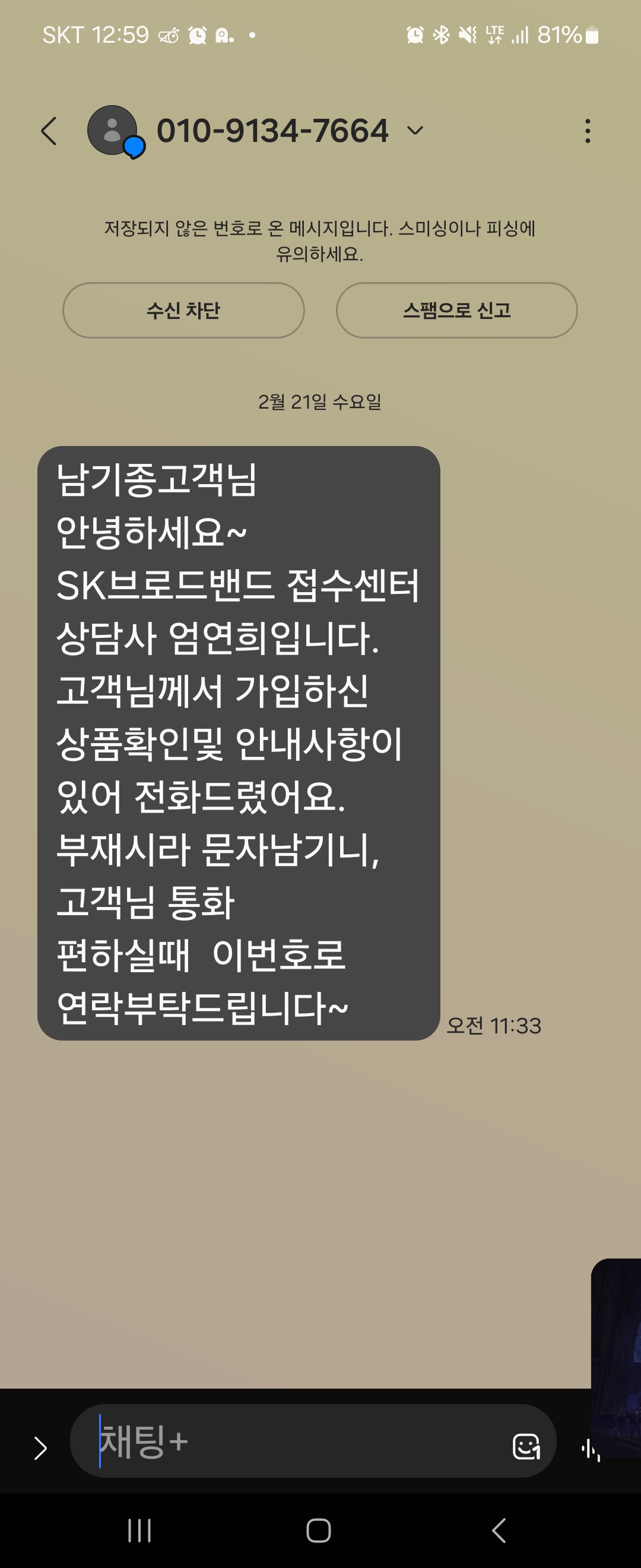 현재 또 010으로 시작되는 번호로 sk브로드밴드 엄연희 라는 상담원이 sk브로드밴드 상품확인및 드린다는데