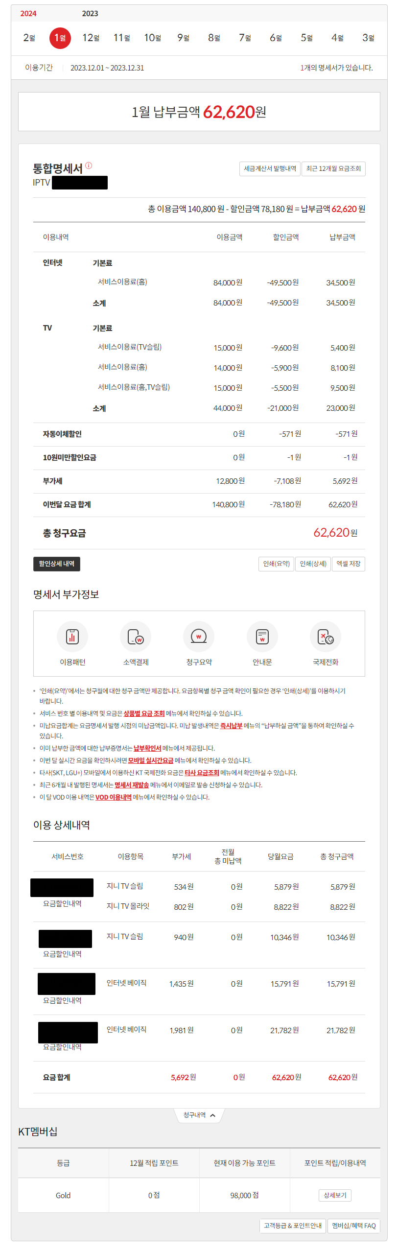 현재 시각 기준으로, KT 500메가급 + 기본 IPTV 1대 = 구성이면?