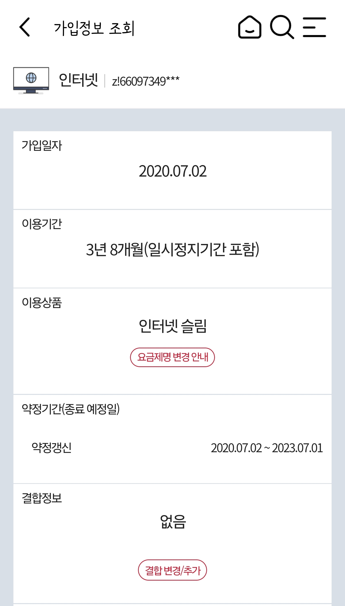 약정기간이 끝나면서 티비요금제 해지하며 통화하기로는 지금 요금이 매우 싼편?이라고 들었던것 같습니다 (벌써 가물가물하네요;;) 지금 확인해보니 결합정보는 없음으로 뜨는데 어찌 할인이 들어가는지는 저도 잘 모르겠숴요