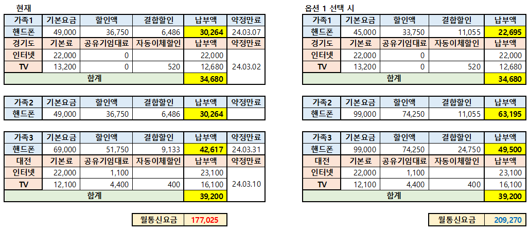 옵션 1. 현재 요금제에서 가족1과 2를 모두 49000요금제에서 45000요금제로 변경하여 재약정만 체결하는 경우
