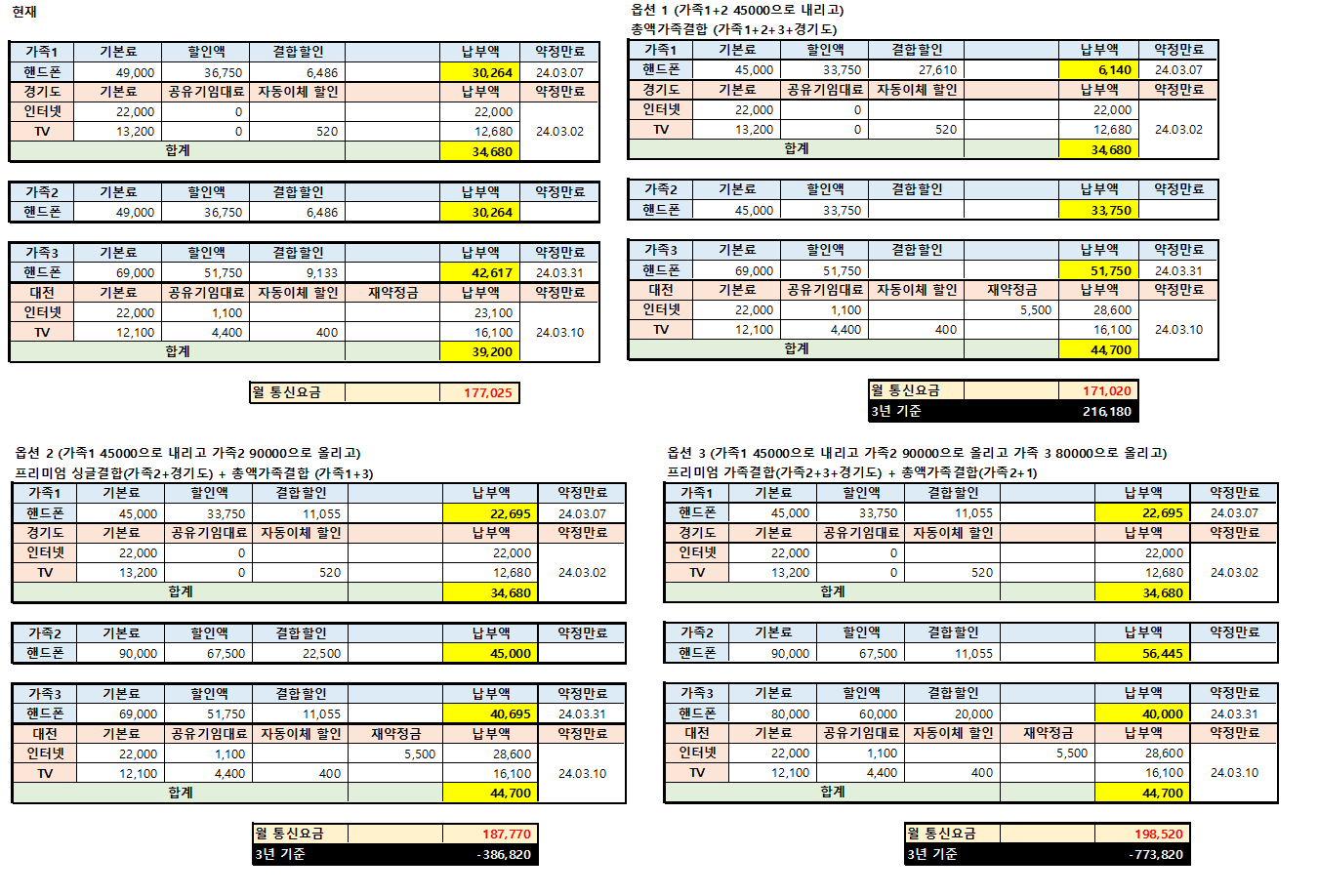 옵션 3. 가족1을 45000요금제로 변경하고, 가족2/3 모두 요금제를 높여서 프리미엄 가족결합으로 묶고 가족1을 총앱가족결합으로 변경하는 경우