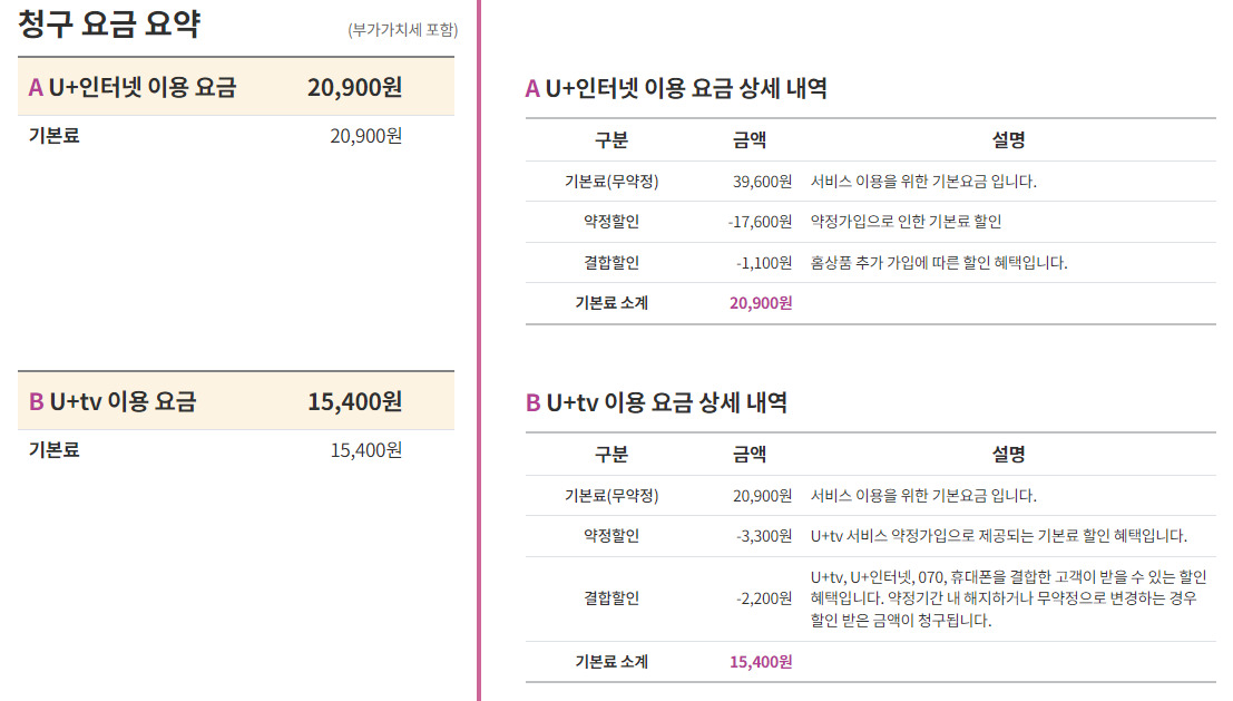 현재 내고 있는 LG U+ 금액이구요  2016년~2019년까지 3년 약정을 하다가 4년간 무약정 사용중입니다. 여태 바보같은 짓 한것 같아서  이번에 업체를 바꾸어 볼려고 하는데 KT는 사업장에서 사용하고 있어서 혜택을 못 받을 것 같아서 SK로 이전해볼려고 하는데  SK휴대전화 회선은 가족2명이 2회선 사용중입니다. 500메가 까지는 필요없고 100메가+IPTV 해서 이전하면 사은품과 이용요금은 어떻게 되는지 아니면 LG재약정과 비교했을 때 어느쪽이 요금이 저렴한지 알 수 있을까요?